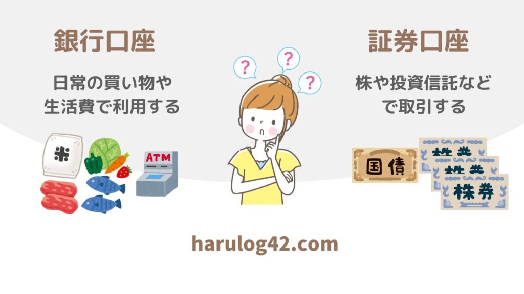一方で証券口座は、株や投資信託などの「お金を増やすための取引」をする場所です。