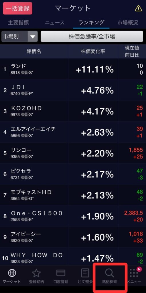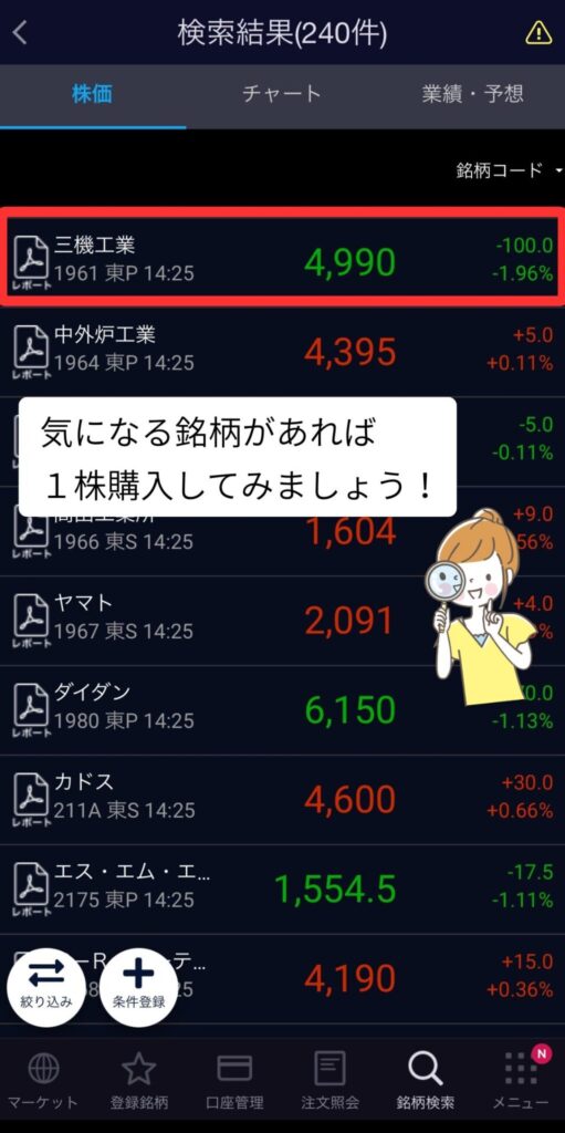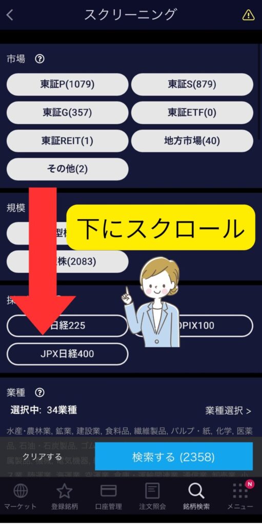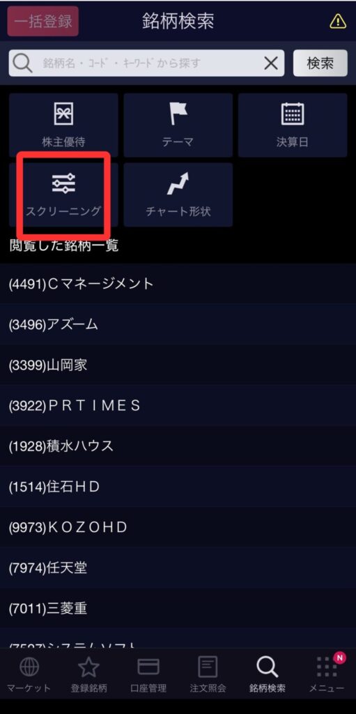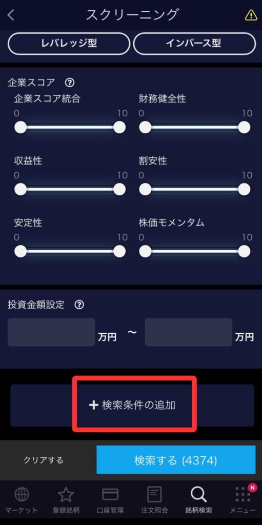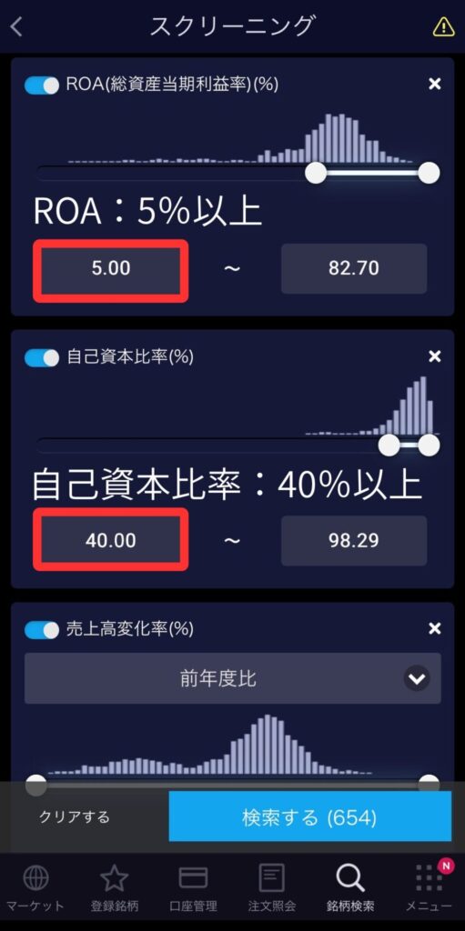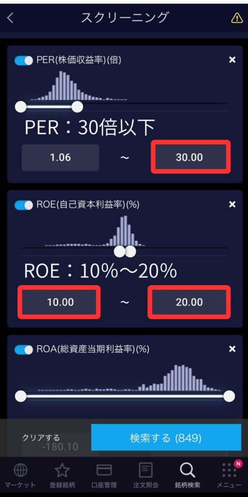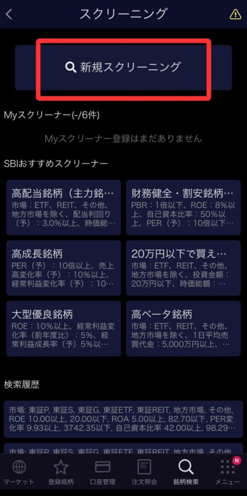 SBI証券アプリの「スクリーニング機能」を使って、今回学んだ指標から優良企業を探してみましょう。