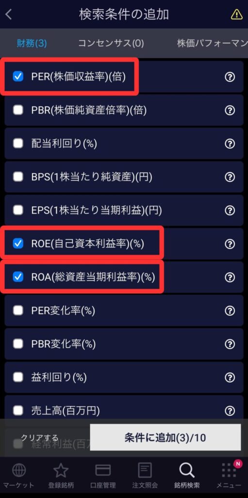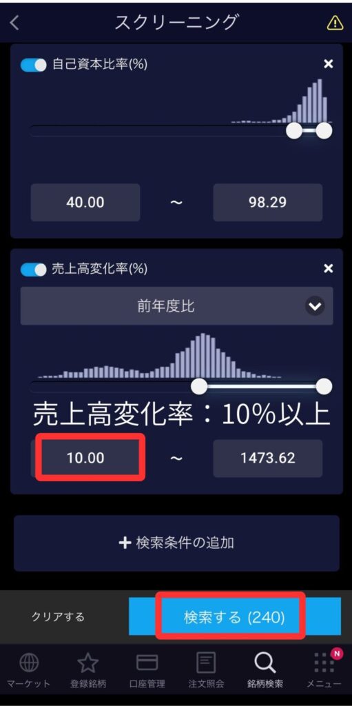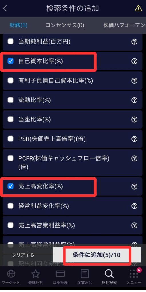 2.「自己資本比率」「売上高変化率」をチェックし、「条件に追加」をタップ