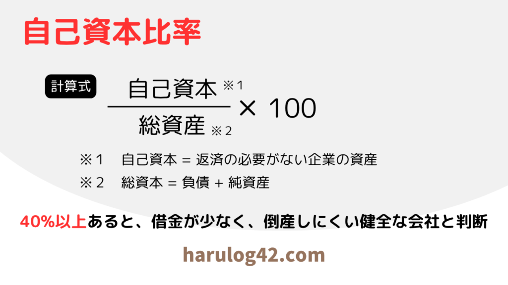 自己資本率 | どれだけ借金に頼らず経営できているのかを表す数 | 40%以上は優良 |
