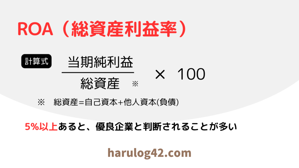 ROA(総資産利益率) | 会社が持つすべての資産を使ってどれだけ利益を生み出せたか | 5%以上が妥当 |