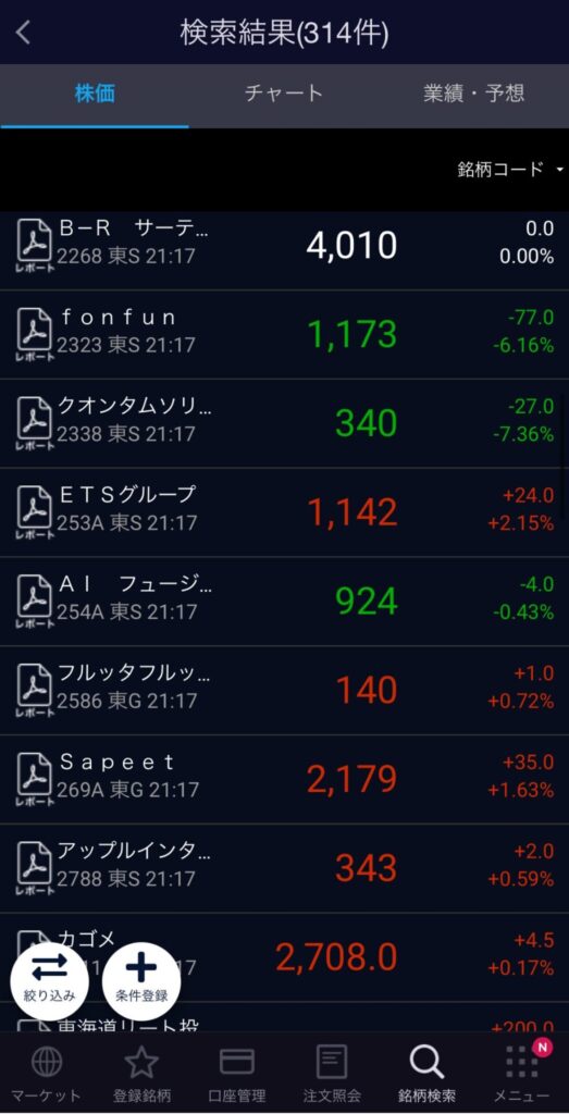 下のメニューにある「銘柄検索」をタップ。