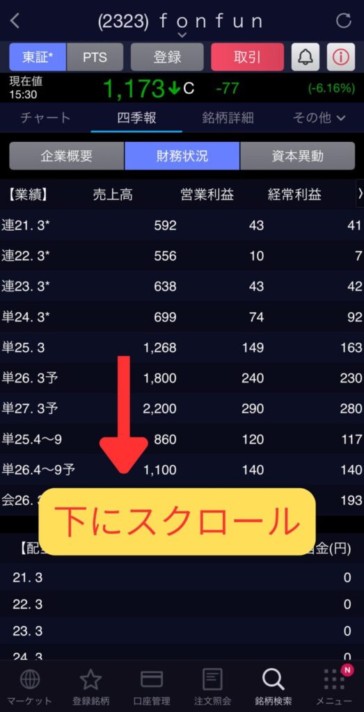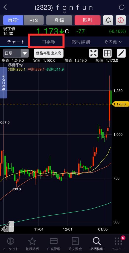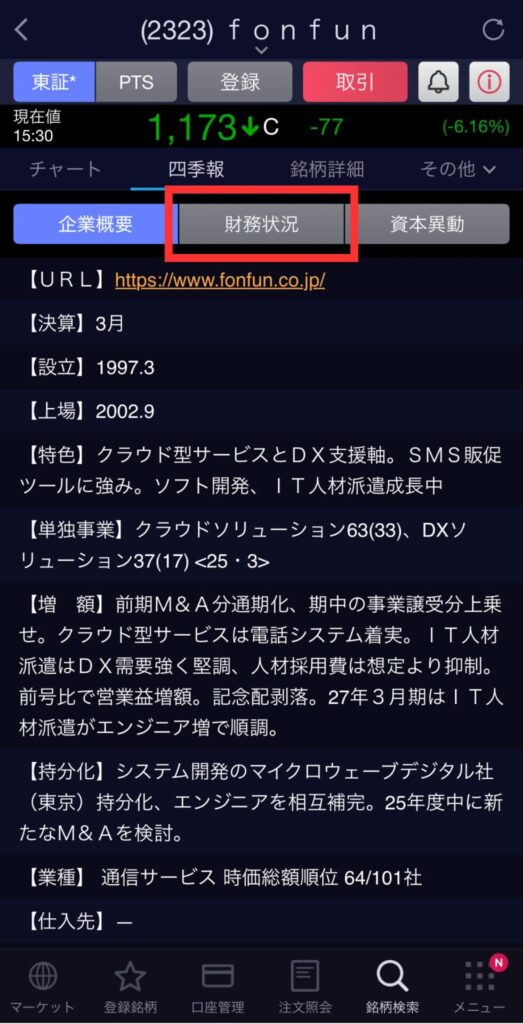 銘柄詳細画面の「四季報」タブをタップ。