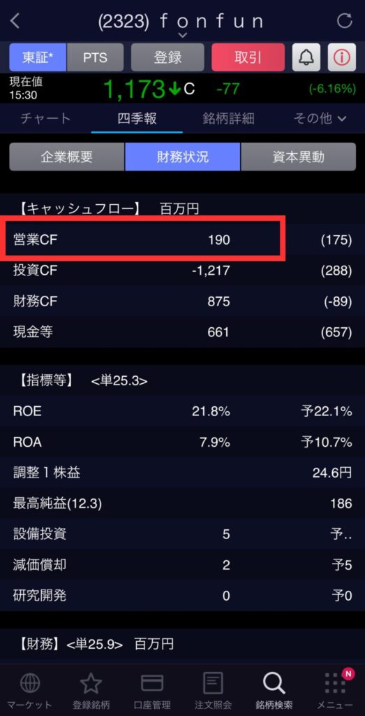「営業CF(キャッシュフロー)」がプラスであることを確認します。